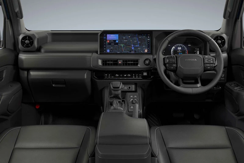 Khoang nội thất của Toyota Land Cruiser FJ được thiết kế thực dụng nhưng không kém phần hiện đại. Bảng táp-lô nhiều lớp, cửa xe phẳng và các chi tiết góc cạnh lấy cảm hứng từ Land Cruiser Prado, với vô lăng ba chấu, cụm màn hình trung tâm cảm ứng hiện đại, bảng đồng hồ kỹ thuật số 12,3 inch, điều hòa tự động và cần số kiểu dáng mới.
