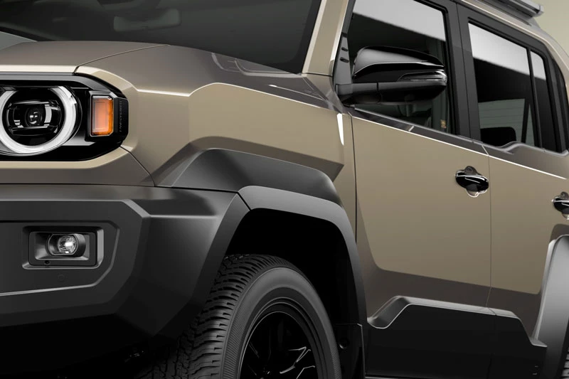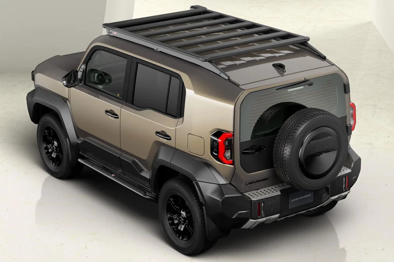 Phần thân xe mang thiết kế chữ nhật đặc trưng với cửa sổ bậc thang, trụ C dày, cửa sau mở ngang và lốp dự phòng gắn ngoài - một chi tiết quen thuộc với những người yêu xe địa hình. Cản trước và sau được ốp nhựa đen dạng mô-đun có thể tháo rời từng phần khi cần thay thế, tương tự triết lý của GR Yaris và Corolla nâng cấp.
