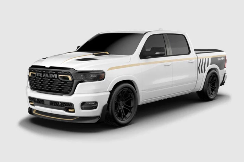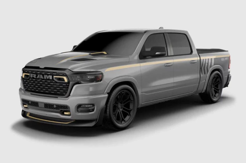Ram 1500 Lowered 2026 được phát triển dựa trên nền tảng Ram 1500 Big Horn, là sản phẩm hợp tác giữa Mopar và Fox Factory - hai cái tên nổi tiếng trong giới độ xe Mỹ. Xe sở hữu bodykit toàn thân với phong cách thể thao mạnh mẽ, kết hợp đường viền vàng nổi bật quanh lưới tản nhiệt, nắp capo, cản trước và hai bên hông, tạo điểm nhấn sang trọng nhưng vẫn giữ chất hầm hố đặc trưng của dòng Ram 1500.