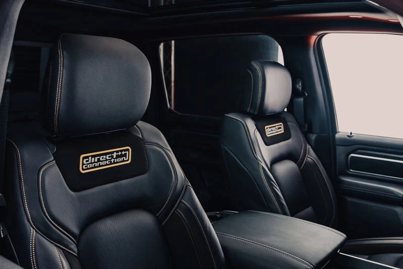 Bên trong khoang lái, Ram 1500 Lowered được hoàn thiện với ghế da đen cao cấp, đường chỉ vàng tương phản, cùng logo Mopar Connection thêu nổi bật trên tựa đầu. Khoang cabin vẫn giữ phong cách rộng rãi, sang trọng nhưng đậm chất thể thao, đúng tinh thần của dòng xe hiệu năng cao Mỹ.