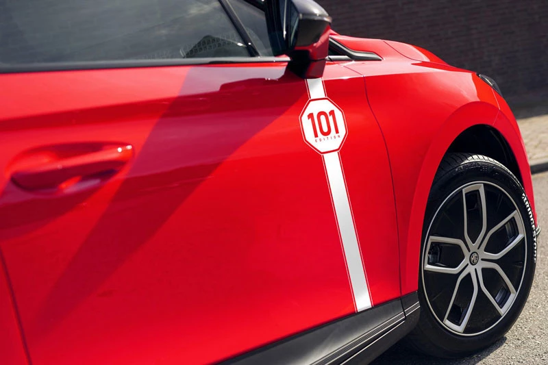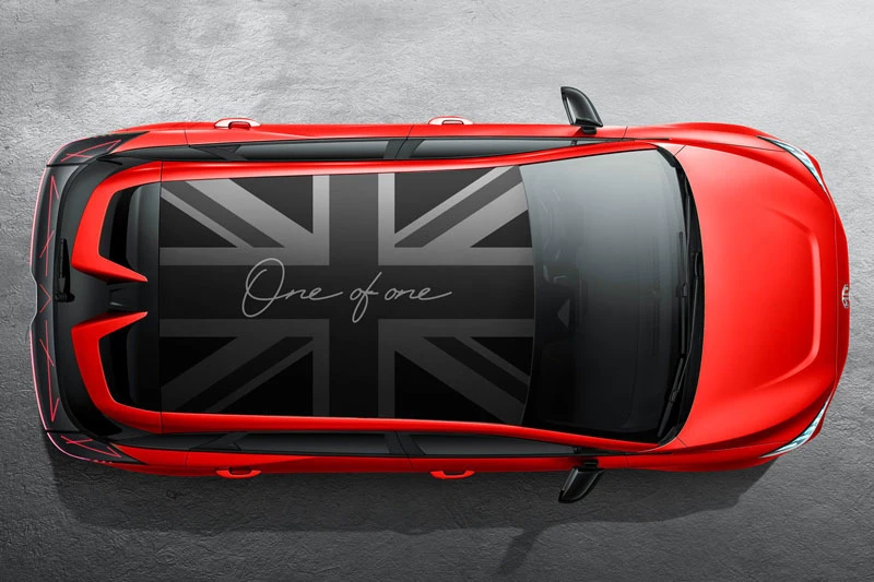 Trên phần mui xe, MG4 EV 101 Edition nổi bật với họa tiết Union Jack - biểu tượng quốc kỳ Anh cùng dòng chữ “One of One” thể hiện tính độc bản. Hai bên thân xe được trang trí bằng decal trắng tinh tế với dòng chữ “101 Edition” đặt ngay dưới gương chiếu hậu, tạo điểm nhấn sang trọng nhưng vẫn giữ phong cách thể thao.