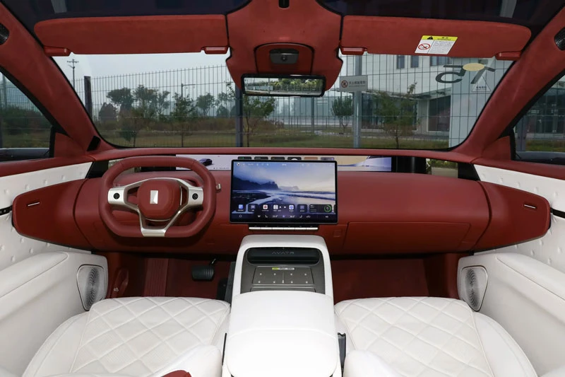 Khoang nội thất của Avatr 12 áp dụng ngôn ngữ thiết kế Gentle Tech tối giản, sang trọng với màn hình toàn cảnh 4K 35,4 inch kéo dài hết bảng táp-lô, kết hợp hai màn hình điện tử hiển thị hình ảnh gương chiếu hậu. Ở trung tâm là màn hình điều khiển 15,6 inch, cùng hàng phím vật lý tinh gọn giúp thao tác thuận tiện hơn. Xe bổ sung tông màu nội thất nâu đá mới và hệ thống buồng lái HarmonySpace 5 thế hệ mới.