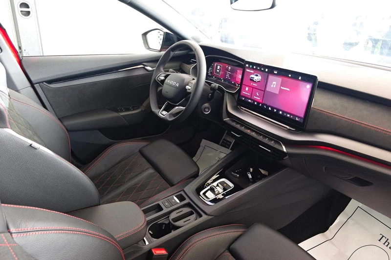Bên trong khoang lái, Skoda Octavia RS tạo ấn tượng mạnh với ghế thể thao bọc Alcantara, chỉnh điện 12 hướng, tích hợp nhớ vị trí, sưởi và massage. Không gian nội thất được hoàn thiện theo hướng thể thao nhưng vẫn cao cấp, kết hợp hai màn hình lớn gồm bảng đồng hồ kỹ thuật số 10,25 inch và màn hình giải trí trung tâm 13 inch hỗ trợ Apple CarPlay không dây. Ngoài ra, xe còn sở hữu hệ thống âm thanh Canton 12 loa, điều hòa tự động hai vùng có lọc không khí và sạc điện thoại không dây, đáp ứng đầy đủ nhu cầu tiện nghi của người dùng cao cấp.