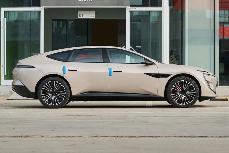 Nhìn từ bên hông, mẫu sedan điện này vẫn giữ kiểu dáng coupe GT fastback với phần mái vuốt mượt về phía sau, tạo cảm giác thể thao và sang trọng. Thân xe được tạo hình rộng với các vòm bánh nổi bật, đi kèm tay nắm cửa bán ẩn hiện đại. Avatr 12 2026 có kích thước 5.020x1.999x1.460 mm (hoặc 1.470 mm tùy hệ thống treo), chiều dài cơ sở đạt 3.020 mm, mang lại không gian nội thất rộng rãi. Tùy phiên bản, xe sử dụng mâm 20 inch hoặc 21 inch, trong đó bản hiệu suất cao trang bị bộ mâm khí động học đi kèm lốp hiệu năng cao.