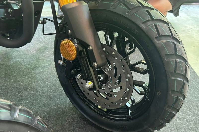 Tương tự các mẫu xe cỡ nhỏ nổi tiếng như Honda MSX/Grom hay Kawasaki KSR, Marvel 150 được trang bị vành xe 12 inch với lốp trước và sau có kích thước 120/70, mang đến khả năng bám đường ổn định. Hệ thống phanh sử dụng đĩa đơn thủy lực trên cả hai bánh, giúp đảm bảo hiệu suất phanh an toàn và chính xác trong mọi tình huống.