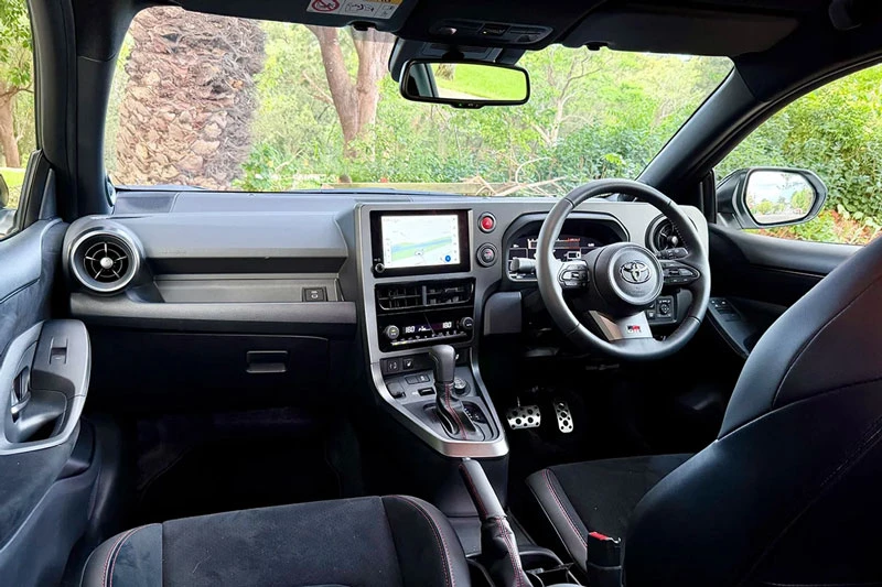 Điểm thay đổi đáng chú ý nhất trên Toyota GR Yaris 2026 nằm ở khoang nội thất với thiết kế vô lăng hoàn toàn mới. Theo Toyota, vô-lăng này được cải tiến nhằm mang lại cảm giác cầm nắm thoải mái hơn, phù hợp với nhiều kiểu đặt tay khác nhau. Các nút điều khiển cũng được bố trí lại theo hướng tách biệt rõ ràng, đặt gần cụm túi khí hơn và cách xa các nan vô lăng để tăng khả năng thao tác. Toàn bộ hệ thống nút bấm đều được trang bị đèn nền, giúp người lái dễ dàng sử dụng trong điều kiện thiếu sáng.