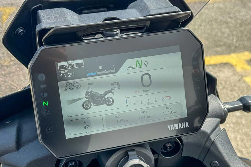 Điểm nhấn lớn nhất trên Yamaha Tracer 9 GT 2026 là màn hình màu TFT-LCD kích thước 7 inch, kéo dài toàn chiều rộng bảng đồng hồ, thay thế cho màn hình LCD phân đoạn cũ. Màn hình này có ba giao diện hiển thị khác nhau, hỗ trợ kết nối Bluetooth với điện thoại thông minh để quản lý cuộc gọi, tin nhắn và nghe nhạc. Đặc biệt, xe còn tích hợp khả năng dẫn đường từng chặng ngay trên màn hình thông qua mô-đun định vị Garmin và ứng dụng Garmin cài đặt trên điện thoại, mang lại trải nghiệm lái touring hiện đại và tiện lợi hơn.