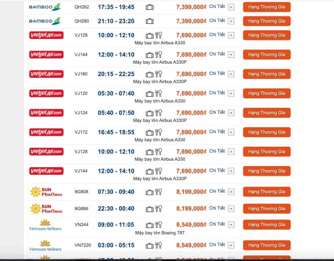 Khảo sát của phóng viên trên đường bay từ Nam ra Bắc, nhiều chuyến bay trong các ngày cao điểm như 24, 25, 26 tháng Chạp âm lịch đã hết vé, hoặc chỉ còn vé phổ thông đặc biệt, thương gia hoặc Skyboss. Vé phổ thông đặc biệt của Vietnam Airlines lên tới 5,3 triệu đồng/chiều, trong khi hạng thương gia gần 10 triệu đồng trên các chuyến bay TP Hồ Chí Minh - Hà Nội.