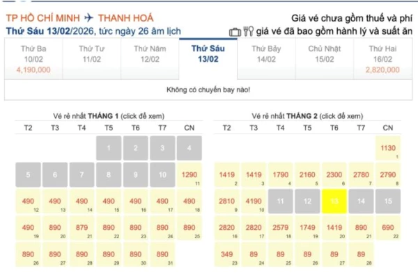 Chặng bay TP Hồ Chí Minh - Thanh Hóa hết sạch chỗ từ ngày 24 - 28 tháng Chạp.