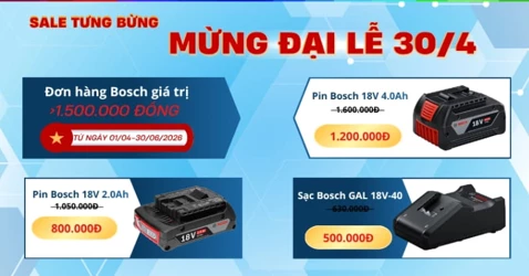 THB Việt Nam đang triển khai chương trình khuyến mãi hấp dẫn cho khách hàng mua dụng cụ Bosch nhân dịp chào mừng Đại lễ 30/4. Cụ thể, trong thời gian từ 01/04 đến 30/06/2026, mỗi hóa đơn từ 1.500.000 đồng sẽ có cơ hội mua pin sạc Bosch với giá ưu đãi đặc biệt: