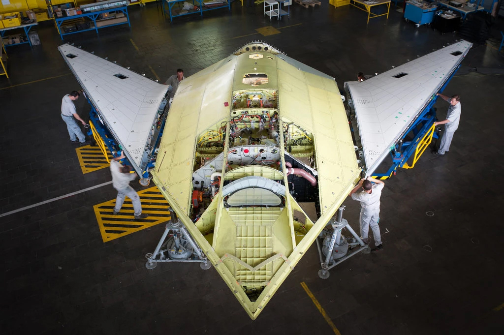 | Một công đoạn lắp ráp của UAV nEUROn tại nhà máy của Dassault Aviation. Ảnh: NY Times. |
