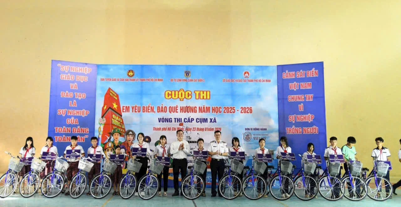 Dịp này, Bộ Tư lệnh Vùng Cảnh sát biển 3 phối hợp với Hệ thống Trường Việt Mỹ trao tặng 15 xe đạp và 20 suất học bổng cho học sinh có hoàn cảnh khó khăn, nỗ lực vươn lên trong học tập. Hoạt động mang ý nghĩa nhân văn sâu sắc, kịp thời tiếp thêm động lực để các em yên tâm học tập, rèn luyện, phấn đấu trở thành những công dân có ích cho xã hội.