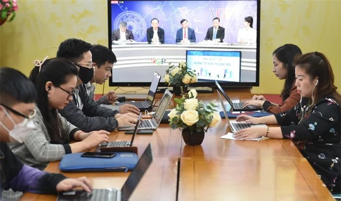 Các phóng viên tham dự Tọa đàm tại đầu cầu Hà Nội. Ảnh: VGP/Nhật Bắc