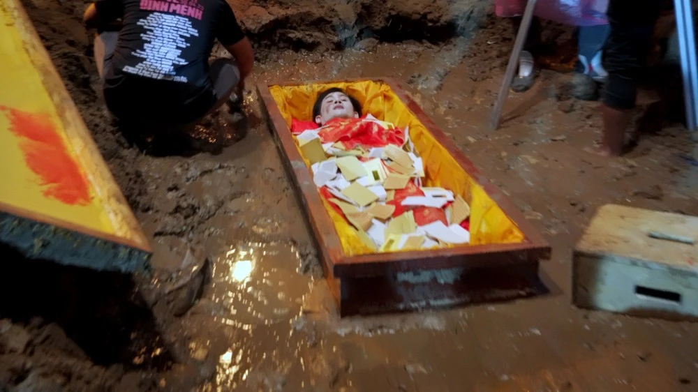 Được biết, bối cảnh của phân đoạn đào mộ ghê rợn này diễn ra tại một nghĩa trang có thật ở làng chiếu Định Yên. Hầu hết khu nghĩa trang này đều đã có mộ chôn, chỉ còn dư ra một mảnh đất nhỏ, Lý Hải và ê-kíp đã phải xin phép và khi được sự đồng thuận của chính quyền địa phương mới có thể bắt tay vào việc xây dựng bối cảnh. Sau đó, anh còn dày công thuê một đội đào mộ chuyên nghiệp để có thể tạo hình ngôi mộ.