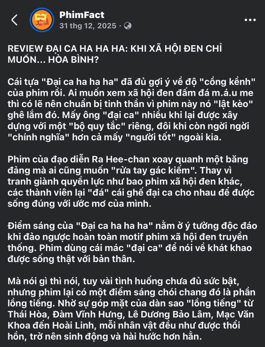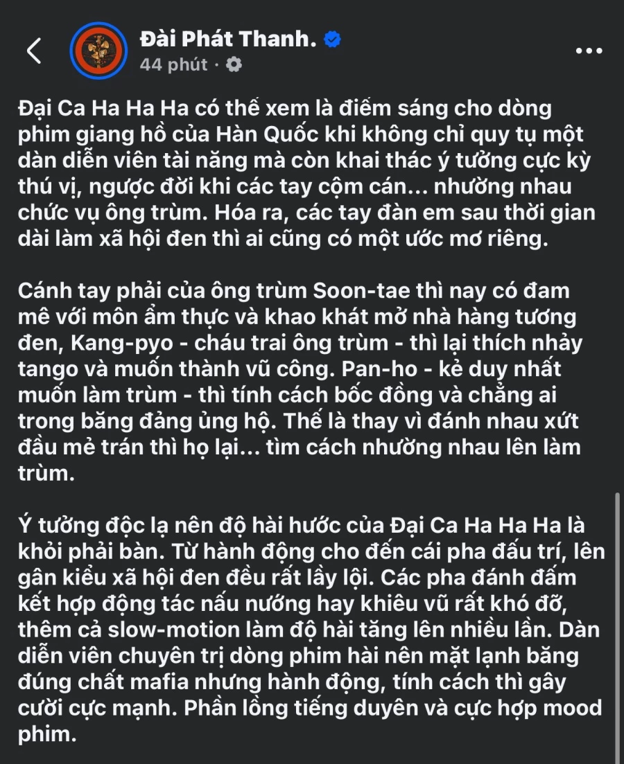 Nhìn chung, “Đại ca ha ha ha” một lần nữa cho thấy sự tinh tế trong cách sáng tạo của điện ảnh Hàn, biến thể loại phim thế giới ngầm đẫm máu thông thường trở thành sân chơi đầy tiếng cười, thậm chí còn lồng ghép những thông điệp ý nhị về cuộc sống. Nếu yêu thích cảm giác nghẹt thở nhưng vẫn đầy đủ tính giải trí, “Đại ca ha ha ha” chính là bộ phim không thể bỏ lỡ ngay dịp đầu năm 2026.
