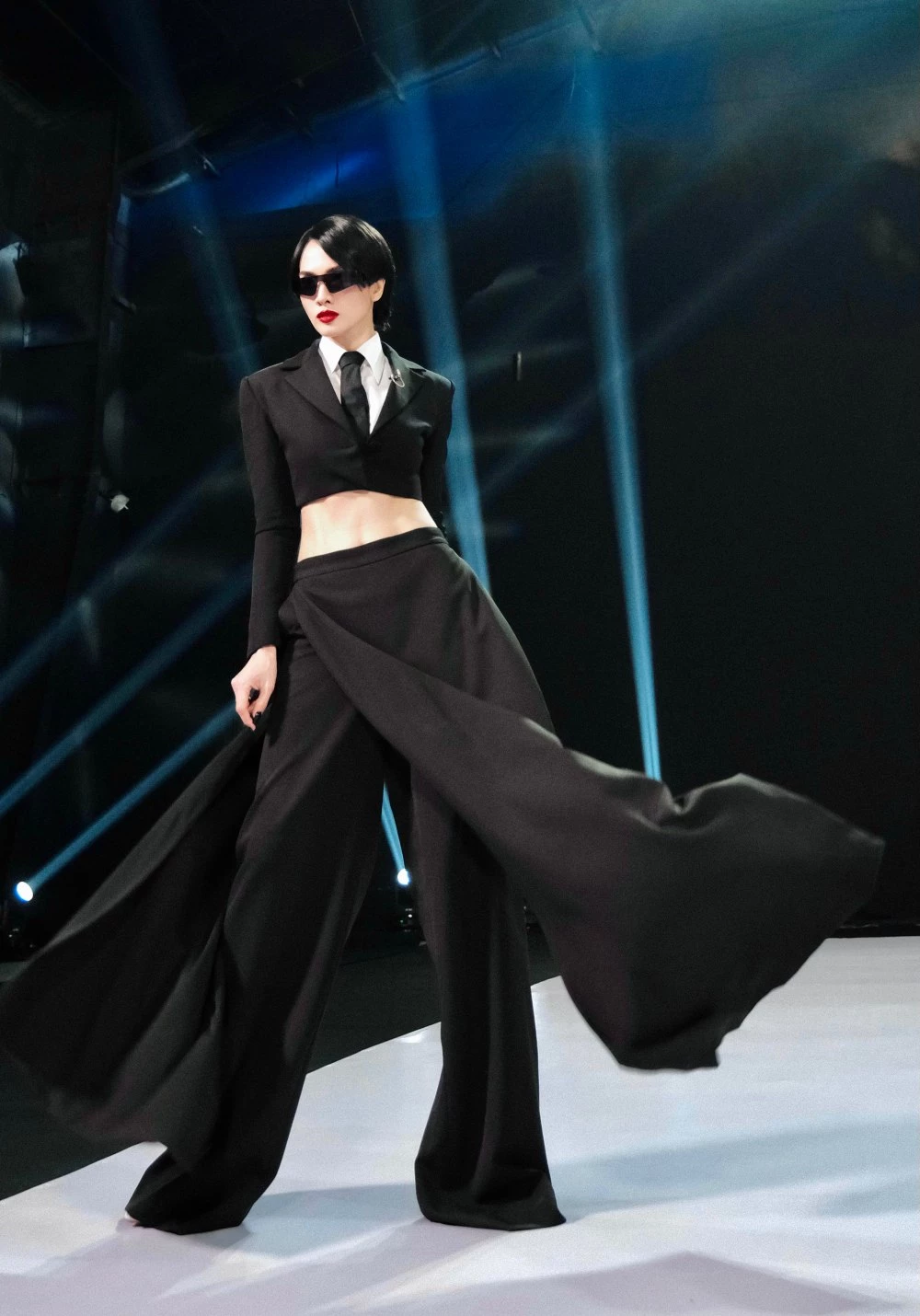Tiếp tục “lăng xê” những phom dáng áo croptop để khoe trọn vòng eo con kiến của mình, HLV Anh Thư xuất hiện ở tập 3 với phong cách thời trang menswear với phụ kiện mắt kính đen ấn tượng.