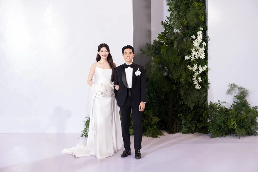 Tại buổi lễ cưới trang trọng trong nhà thờ, Á hậu Quỳnh Châu lựa chọn diện thiết kế của NTK Lê Thanh Hòa, được thực hiện riêng để tôn vinh khoảnh khắc thiêng liêng nhất của người phụ nữ. Chiếc váy mang dáng silhouette cổ điển ôm dài, được cắt may từ chất liệu satin cao cấp với độ bóng nhẹ, mang đến hiệu ứng ánh sáng tinh khôi và sang trọng.