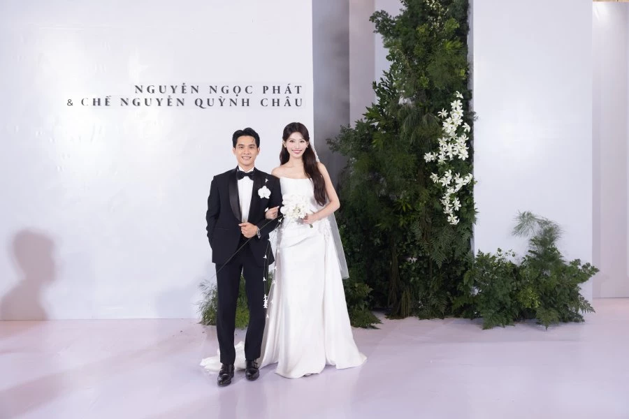 Sau khoảnh khắc trang nghiêm trong lễ cưới tại nhà thờ, Á hậu Quỳnh Châu tiếp tục chọn một thiết kế khác của NTK Lê Thanh Hòa cho phần đón khách tại tiệc cưới. Lấy cảm hứng từ đóa hoa mẫu đơn, loài hoa được xem là biểu tượng của tình yêu viên mãn và sắc đẹp kiêu kỳ, chiếc váy được tạo tác trên nền satin trắng ngọc trai với đường cắt gọn gàng, tôn dáng.