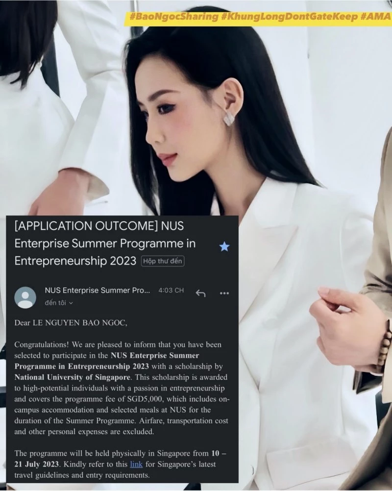 Đứng trước một cơ hội lớn, Bảo Ngọc trải lòng: “Đang ngồi thẫn thờ trên xe sau mấy ngày liên tục mất ngủ vì chạy show và deadline tứ phía, thì Ngọc nhận được thông báo trên mail rằng mình đã được chọn để nhận học bổng cho chương trình NUS Enterprise Summer Programme on Entrepreneurship 2023. Đây là một trong những chương trình mà Ngọc mong chờ kết quả nhất, không phải vì “lại thêm một học bổng vào profile”, mà vì đây thật sự là chương trình có ý nghĩa rất lớn với hành trình theo đuổi lĩnh vực khởi nghiệp - đổi mới sáng tạo của Ngọc kể từ 2019.”