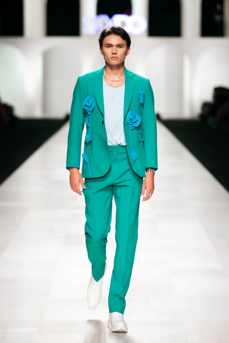 Trang phục của nam giới cũng được anh làm mới với nhiều gam màu nổi bật, trong đó có cả những thiết kế đính hoa 3D to bản. “Thời trang nam đôi khi bị gò bó trong một khuôn khổ nào đó. Tuy nhiên, với tôi, cái đẹp là không giới hạn. Chúng ta nên có nhiều sự sáng tạo hơn nữa, để từ đó chọn lọc, phát triển những điều phù hợp”, NTK họ Đỗ chia sẻ.