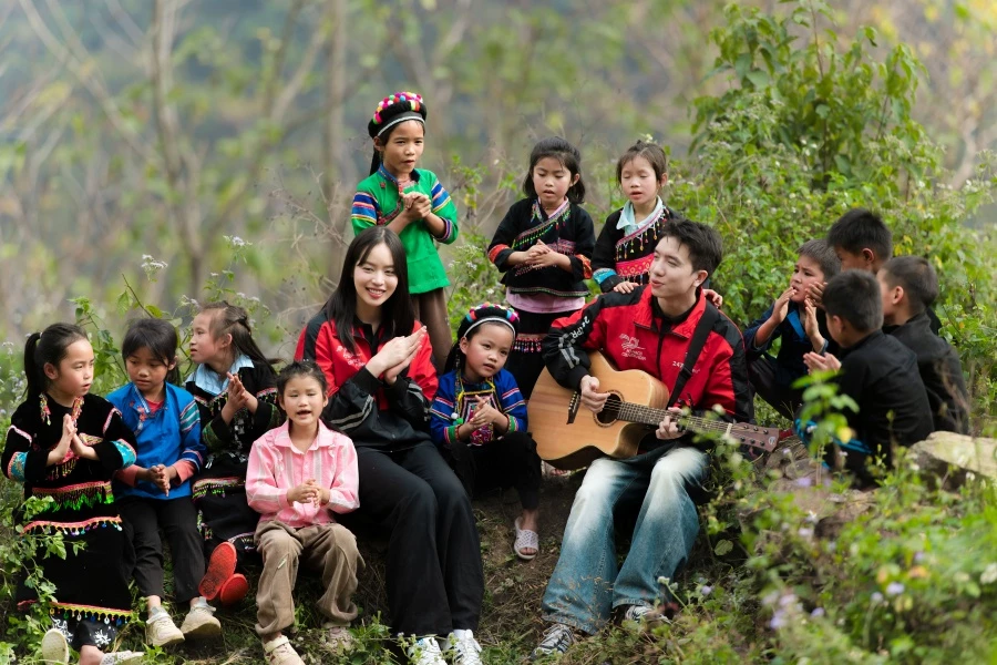 Hoa hậu Thanh Thuỷ“debut” ca hát trước khán giả là các em học sinh vùng núi.