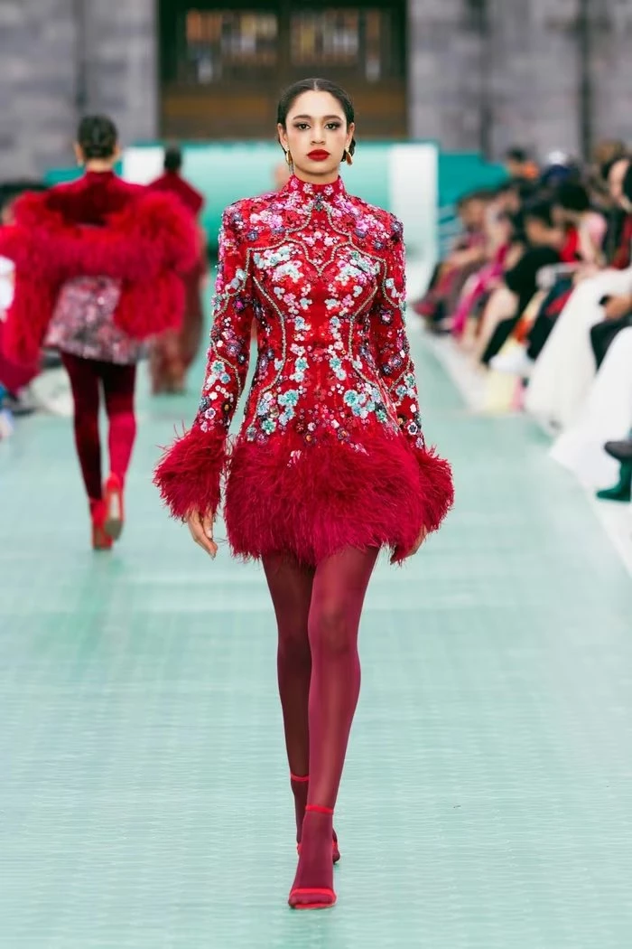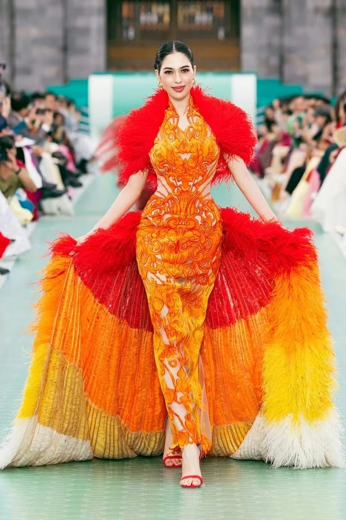 Ngay sau đó, dàn người mẫu là các thí sinh lần lượt sải bước trên nền nhạc mang âm hưởng nhã nhạc. Mỗi thiết kế là một cấu trúc thẩm mỹ nơi Lê Thanh Hòa khai thác tối đa kỹ thuật xử lý chất liệu, phom dáng và màu sắc. Dù bảng màu gồm các tông đỏ, vàng, hồng, tía rực rỡ, vốn rực rỡ nhưng khi phối và tiết chế khéo léo lại không chút chói mắt, trái lại mang đến cảm giác thanh lịch và sang trọng, như một bữa tiệc cung đình qua lăng kính thời trang.