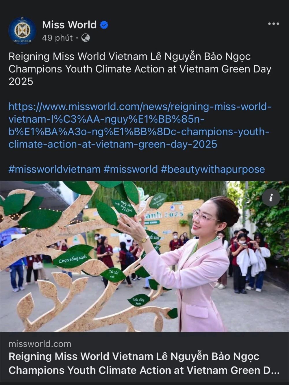 Trên fanpage và website chính thức, tổ chức Miss World đăng tải bài viết về đại diện Việt Nam là Hoa hậu Lê Nguyễn Bảo Ngọc với tiêu đề “Reigning Miss World Vietnam Lê Nguyễn Bảo Ngọc Champions Youth Climate Action at Vietnam Green Day 2025”. Tạm dịch là “Hoa hậu Thế giới Việt Nam Lê Nguyễn Bảo Ngọc tiên phong hành động vì khí hậu tại Vietnam Green Day 2025”.