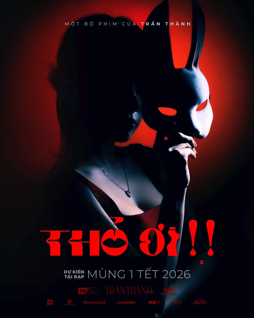 First look poster của “Thỏ ơi!!” mang sắc thái đỏ và đen gần giống với first look trailer, chính giữa là hình ảnh một cô gái mặc váy đỏ giấu mặt trong bóng tối, trên tay cầm chiếc mặt nạ thỏ. Dường như đây chính là nhân vật cô gái bí ẩn đang tìm cách chia tay gã người yêu cuồng kiểm soát kia. Vẻ thần bí khác hẳn sự rụt rè khiếp sợ trong first look trailer càng khiến người xem tò mò về nhân vật khuất trong bóng tối này, càng tò mò hơn về diễn viên đứng sau vai diễn.