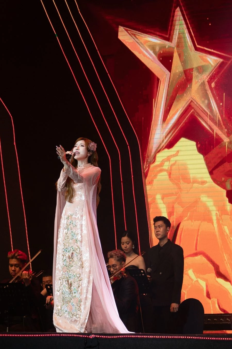 Nữ ca sĩ diện áo dài, diễn ca khúc Mãi là người Việt Nam, bài hát đã giúp cô có mặt trong Top 5 đề cử hạng mục “MV của năm” tại giải thưởng năm nay. Ca từ mang ý nghĩa khơi gợi niềm tự hào là người con Việt Nam, giúp ca khúc lan tỏa mạnh mẽ và được yêu thích thời gian qua.